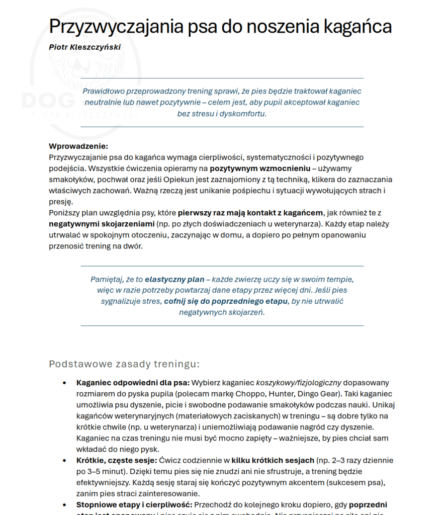 Przyzwyczajanie psa do noszenia kagańca Posted by Piotr Kleszczyński Posted on 2025-07-12 1 Likes 35 Views 5,00 PLN – Zakup Do płatności Dodano do koszyka Zawiera 5% podatku Author: Piotr Kleszczyński Skype Related Articles Spacer Agresja „smyczowa” Lęk, strach? A może coś innego? Lęk separacyjny